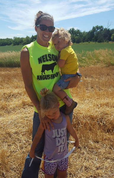 Becky Nelson, who grew up on a farm in northeast Kansas, now farms with her husband’s family outside of Leonardville, Kansas. They have livestock and crops, wheat, soybeans, milo and corn. They raise Angus and have a little feedlot.